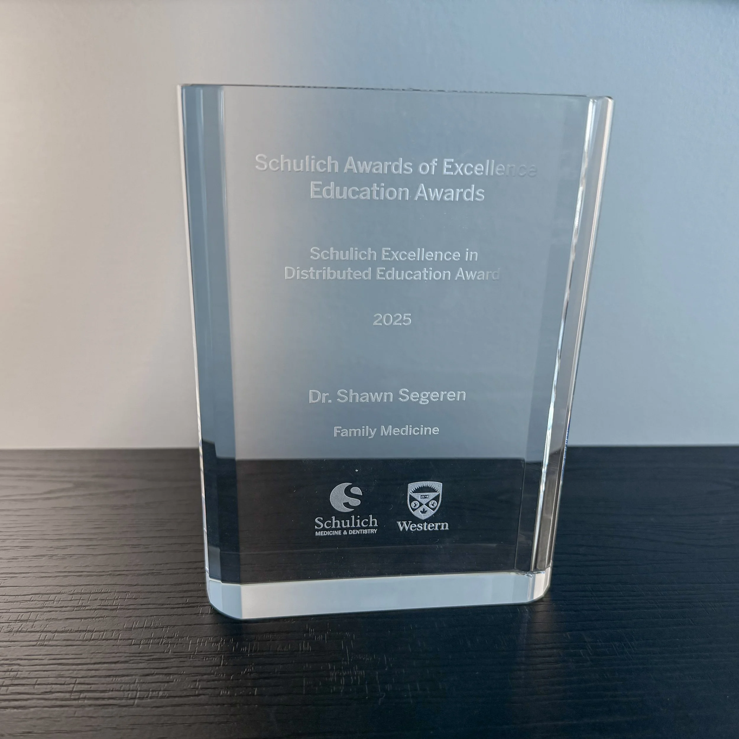 In 2025, Dr. Segeren was honored with the Schulich Award of Excellence, a recognition given to outstanding faculty members within the Schulich School of Medicine & Dentistry. The award highlights his dedication to teaching and supporting students and residents across distributed education sites, and celebrates his leadership, commitment to learner success, and passion for medical education.